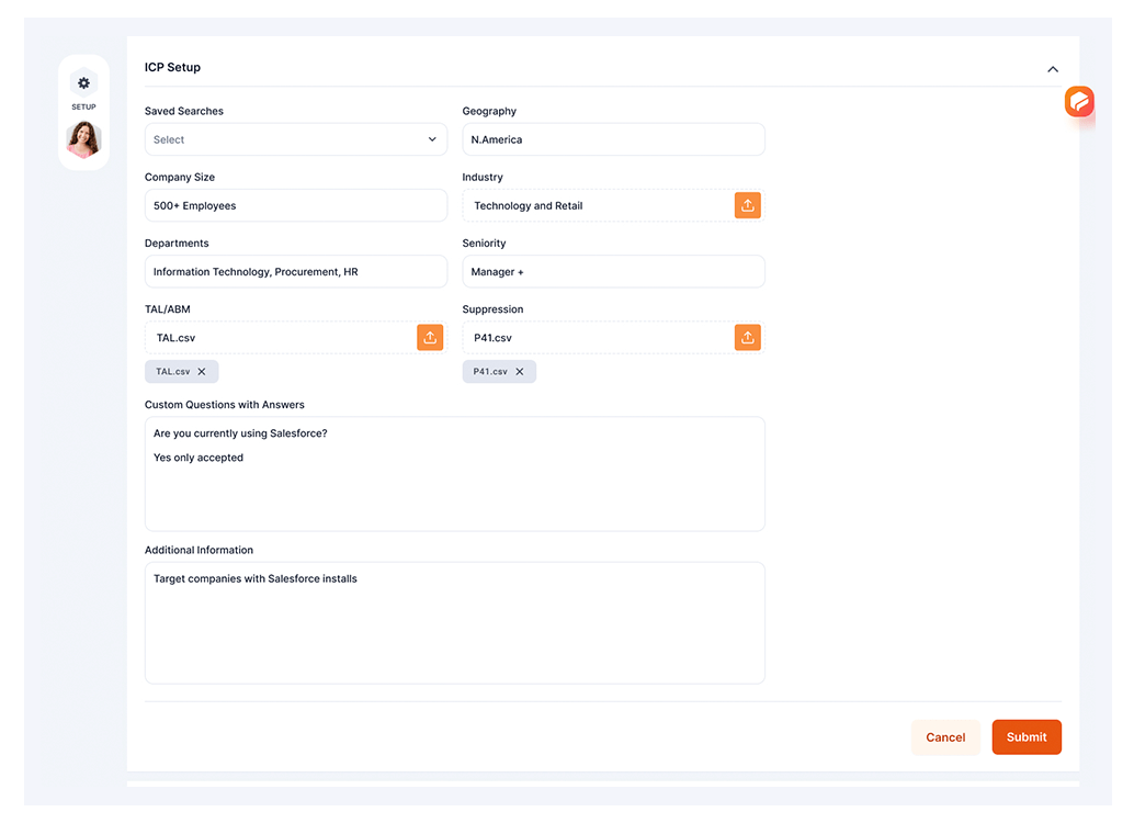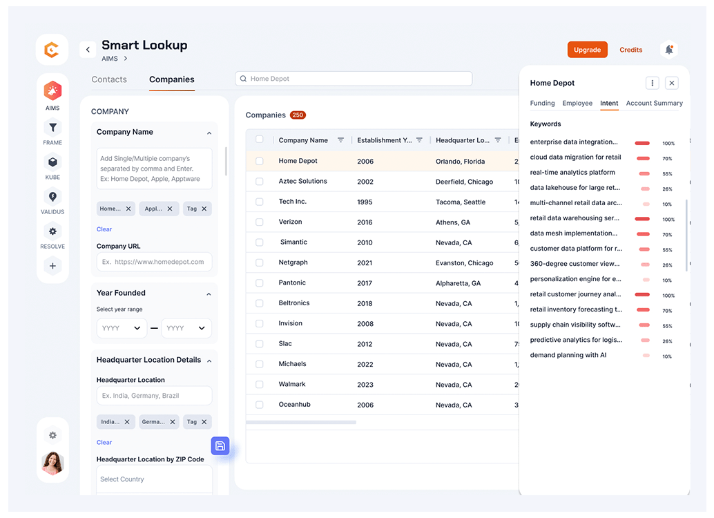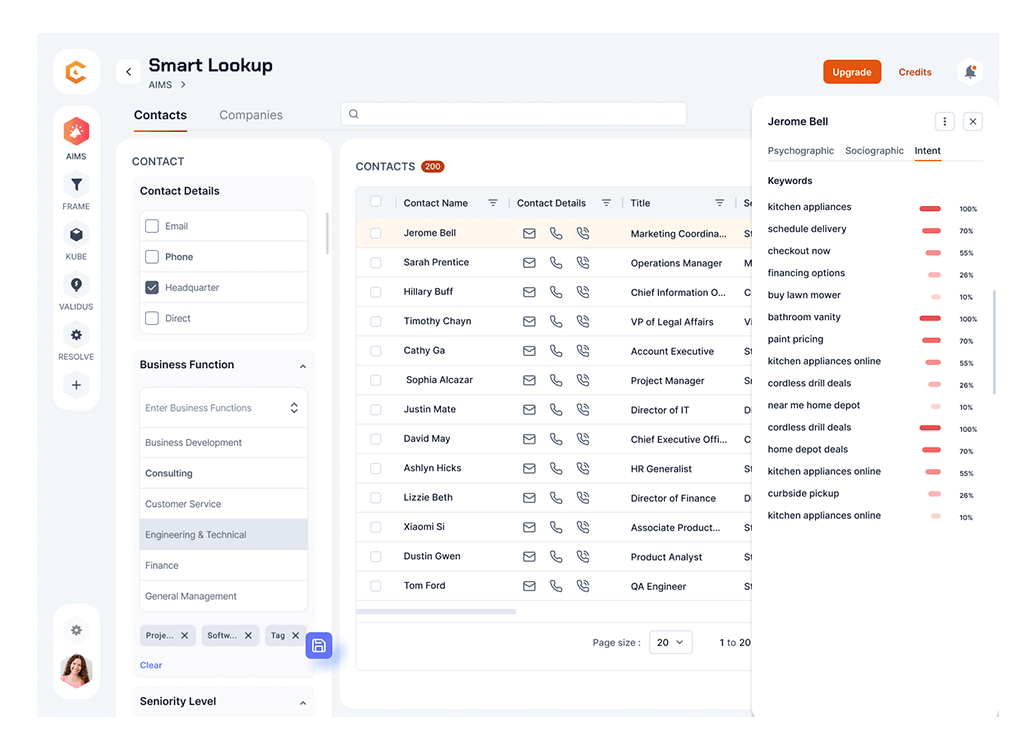 Discover and qualify contacts and accounts in real-time using advanced filters across intent, firmographics, technographics, dark social signals, and more.